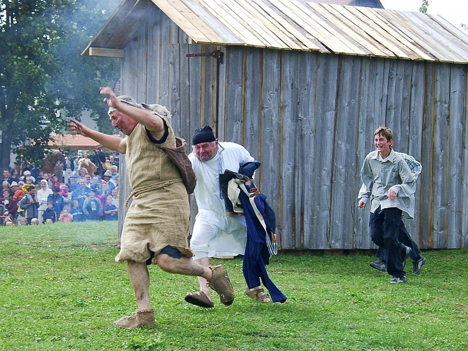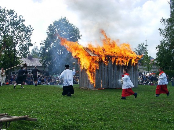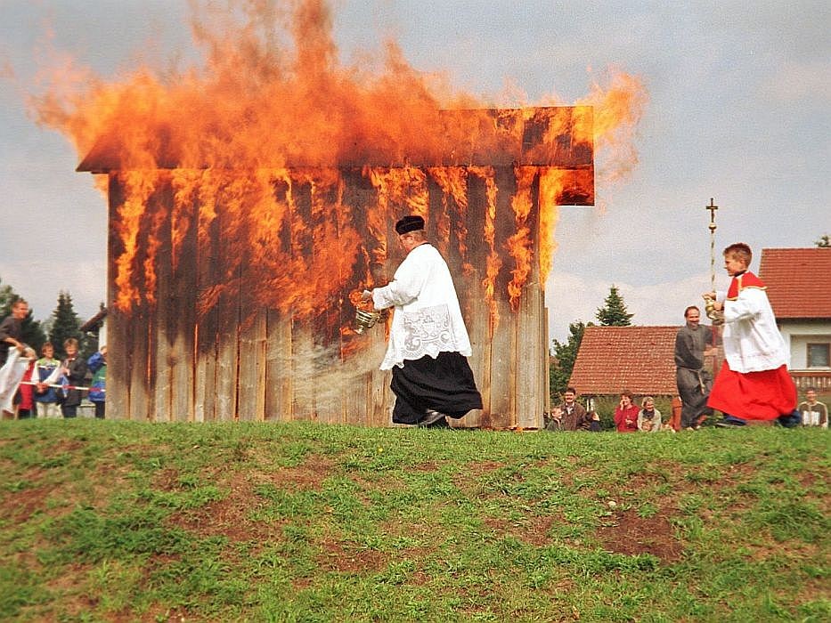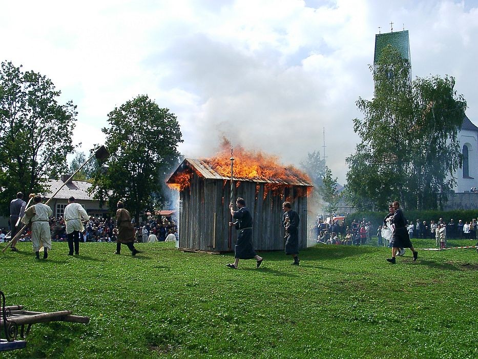Auch der Standpunkt der Kirche zum Mythos Feuer im Mittelalter wurde aufgezeigt: das Brand segnen durch Priester, Mönche, Ministranten, der Aberglaube mit Feuerreitern in schwarzen Umhängen, Zaubersprüchen und Zaubertafeln.