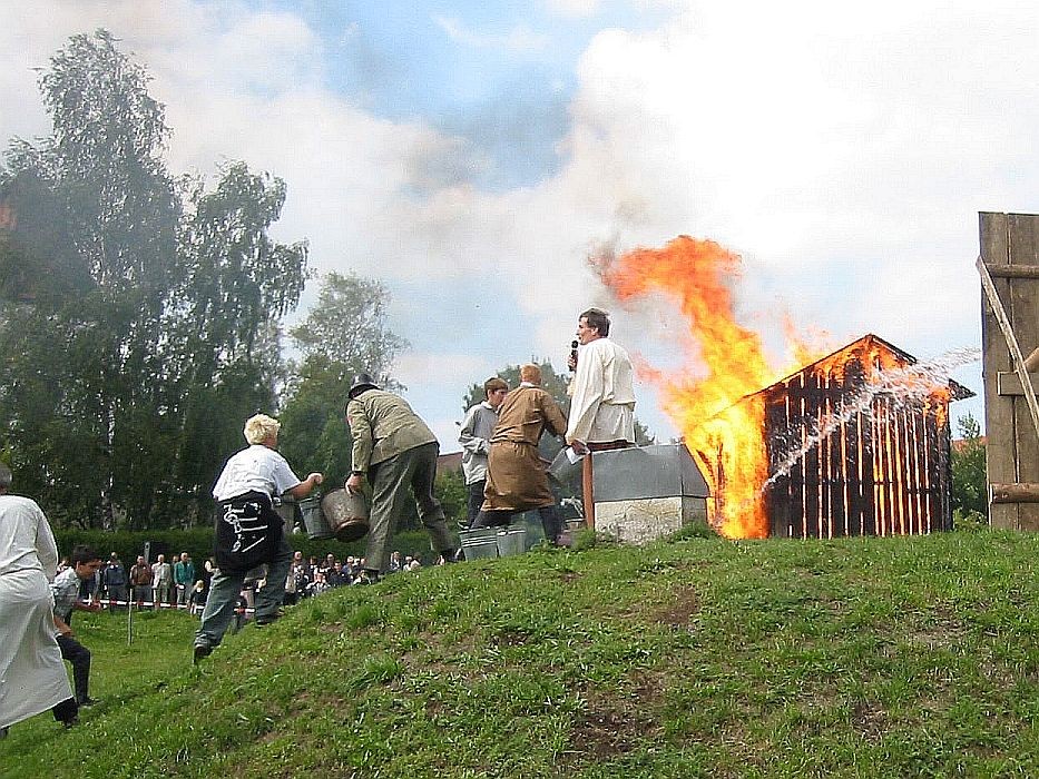 An einem brennenden Objekt auf dem Grundstück des ehemaligen Wasserschlosses wurden die damaligen Löschmethoden vorgeführt.