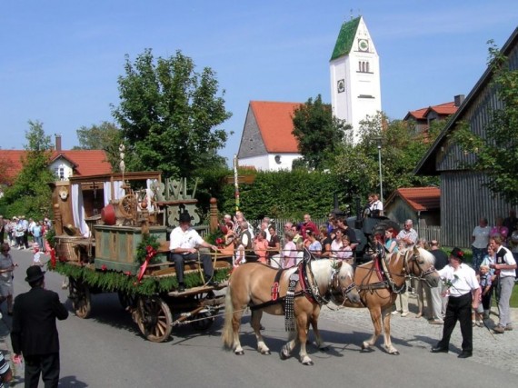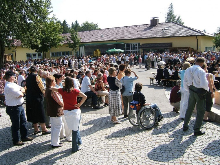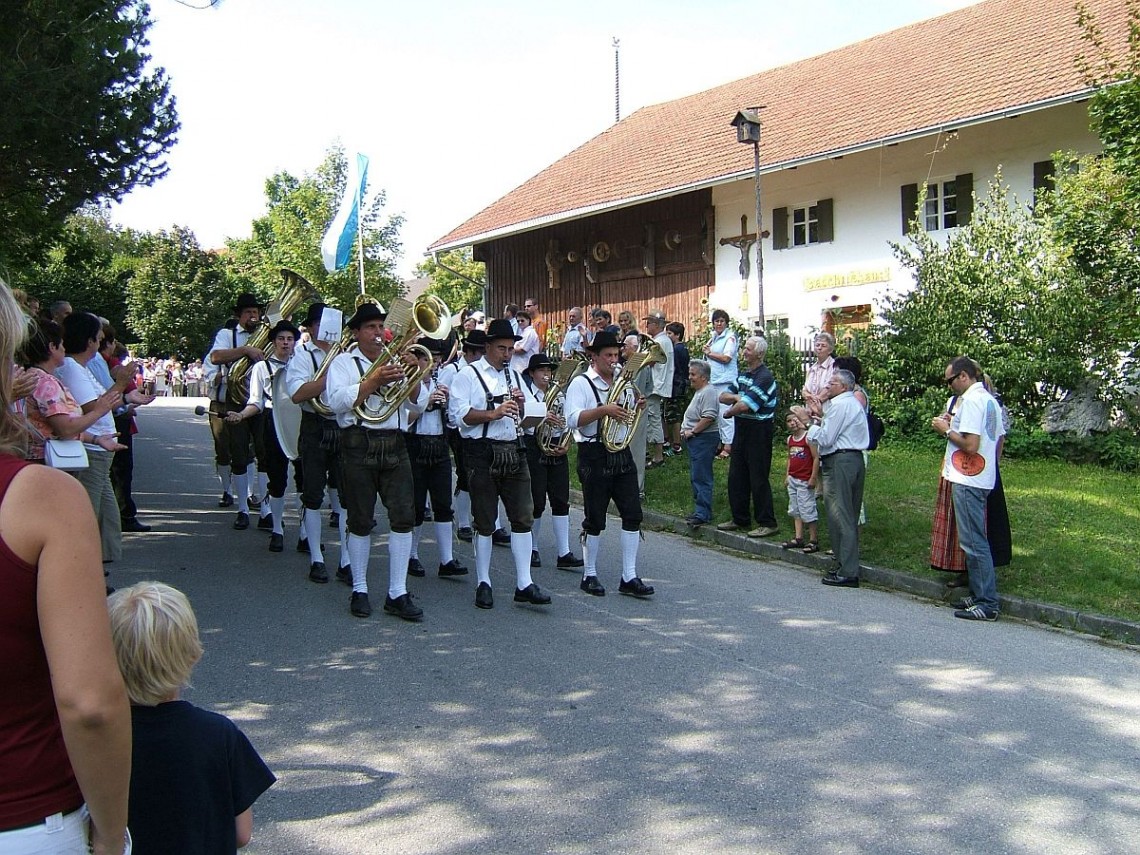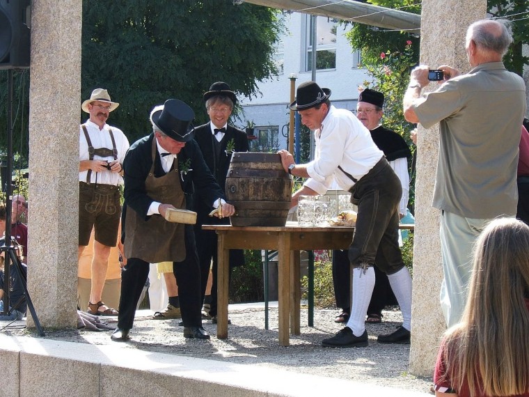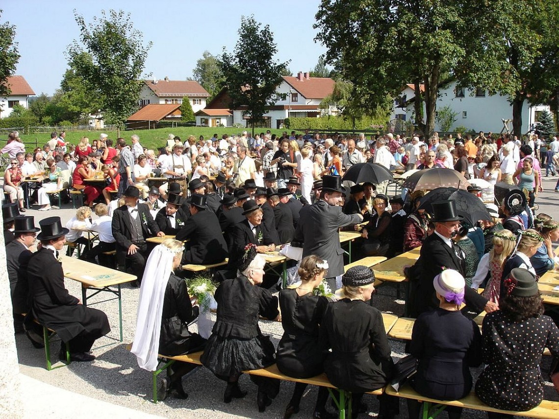 Bei bestem Wetter führte der Hochzeitszug durch die Schwabenstraße zum Schulhof. Dort wurde eine standesamtliche Trauung nachgespielt. Anschließend spielte die Musikkapelle Ebenhofen mit „Altbayerischer Blasmusik“ auf. Bei gemütlichem Beisammensein und Bewirtung, auch mit dunklem Bier der damaligen Zeit, klang das Fest aus.
